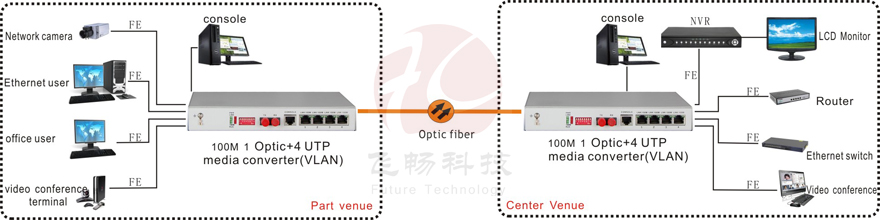 The optical fiber transceiver is optical transmission VLAN switch. It has 5 switch interface an interface is optical fiber interface can extend local LAN through this interface. Each switch interface can divide VLAN. There are two ways of dividing VLAN: Division of VLAN base PORT this method does not affect the remote device; 802.1Q VLAN Division at this time the local and the remote interface can be divided into the same VALN. The division of VLAN can be controlled by Console port. Device provides Console port supports Terminal control device