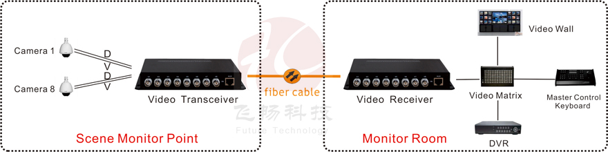 This digital video optical transceiver adopts digital video encoding and gigabit optical fiber transmission technology. The multi-channel single-direction bi-direction audio, video, data, telephone, Ethernet and switch real-time synchronization, no-distortion and high quality transmission is on the single-core or dual-core optical fiber. Complete digital video non-compression transmission technology, with video and data condition indicator, can monitor the system normal operation. It uses modular design, the user can flexibly select or customize configuration based on the scene occasion. Rack installation or desktop installation can be optional. This product is made up of optical transmitter and receiver. It can transmit 8Channel forward direction Video and 1Channel reverse direction RS485 data.
