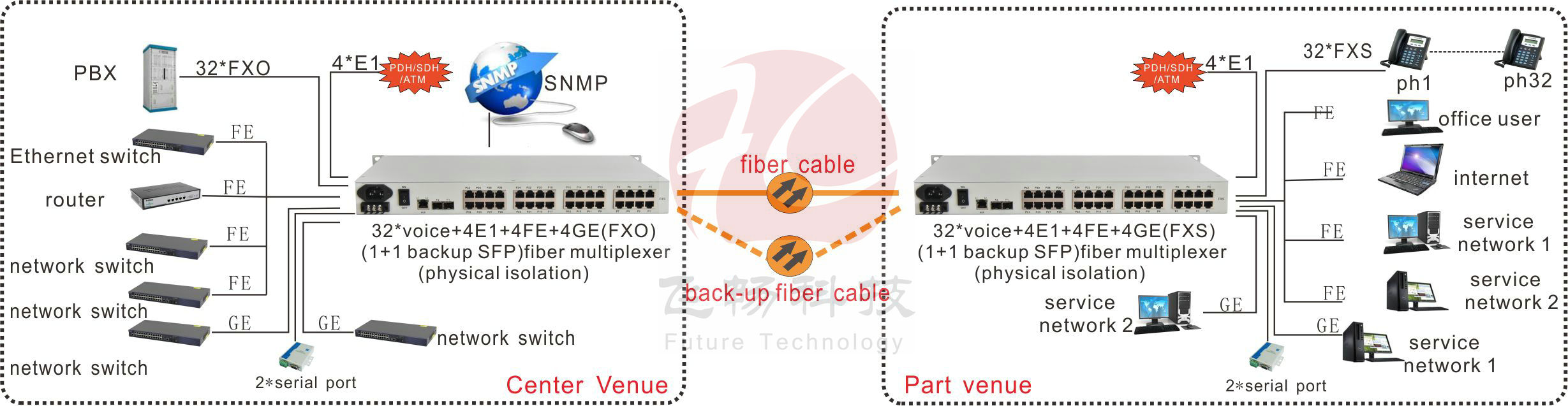 This device is a kind of our company developed point to point transmission equipment based on specific VLSI,it provides 32 channel voice,4 E1 interfaces 4channel 100M Ethernet interface4channel 1000M Ethernet interfacethe 4channel 100M EthernetEach Ethernet port has its own independent bandwidth; 4 gigabit Ethernet port,1-2 as a group 3-4 port as a group each group has a separate gigabit bandwidththe 6 channel Ethernet total bandwidth is 2400Mtransmission over one fiber 4 Fast Ethernet signal is completely independenttwo group Gigabit Ethernet signal is completely independent non-interfering independently of each other that is physical isolation; and one expansion interface. 1 Extended service interface (can be used as 1~2*RS232 / RS485 / RS422 asynchronous data 1~4*dry contact signal) the application is very flexible.support SNMPconsoleSFP 1+1 fiber backup.