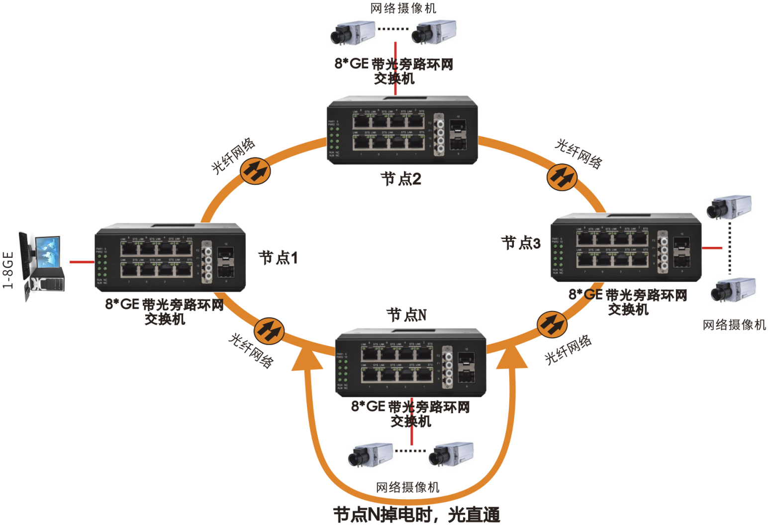 9口SFP的LC接口插入9的LC口子上,10口SFP的LC接口插入10的LC口子上,F(xiàn)1,F2 為上聯(lián)口與下聯(lián)口,當某處設備掉電時,兩個F1,F2 光口為直通接口;