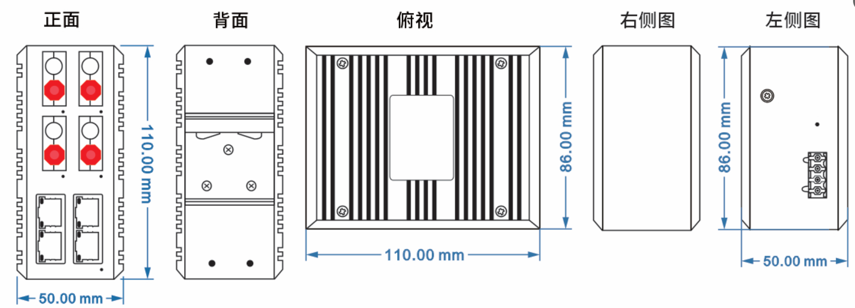 外殼:IP40防護(hù)等級(jí),鋁合金材質(zhì) 尺寸:110mm(長(zhǎng)) x 86mm(寬) x 50mm(高)(高) 安裝方式:導(dǎo)軌安裝、壁掛式安裝 |