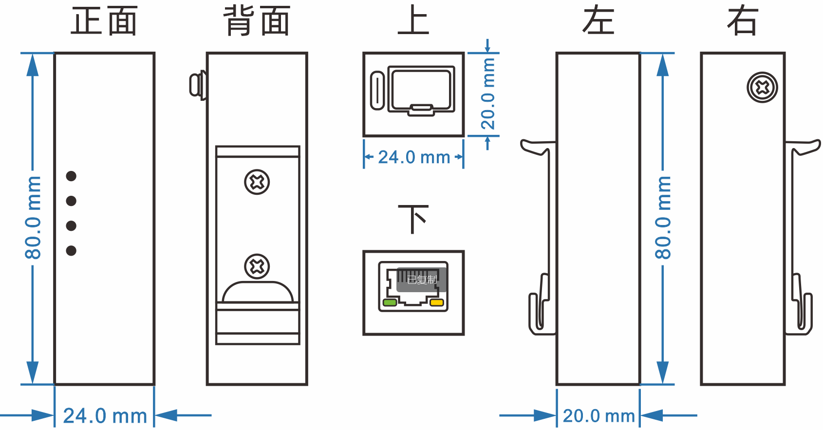 外殼:IP40防護(hù)等級(jí) 尺寸:24mm(長(zhǎng)) x 80mm(寬) x 20mm(高) 安裝方式:導(dǎo)軌安裝、壁掛式安裝 |